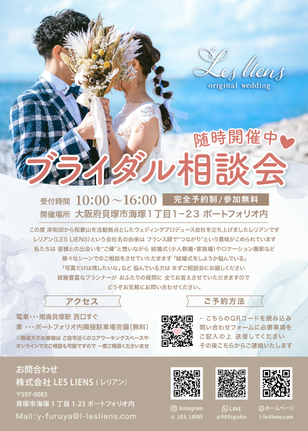 岸和田から和歌山を拠点としたウェディングプロデュースするLESLIENS(レリアン)のHPです